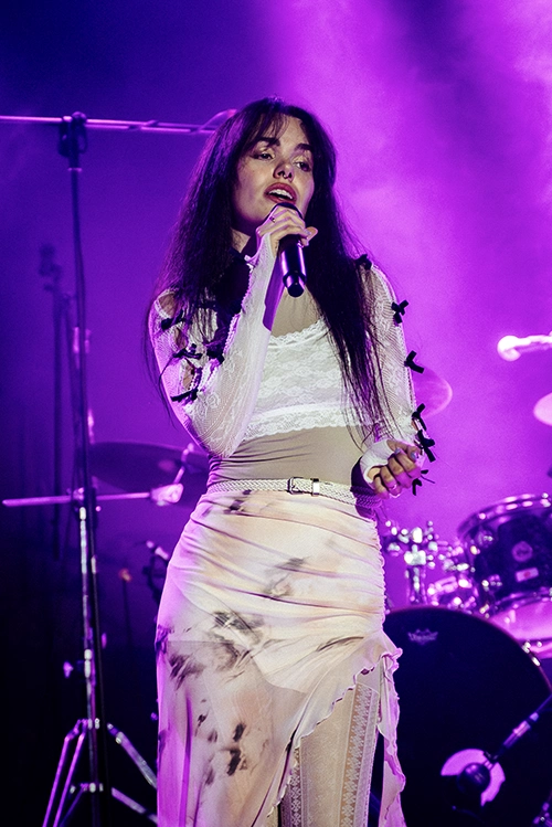 La noche comenzó con Atzur, una propuesta muy interesante desde Barcelona que fusiona pop alternativo con pistas electrónicas. Voz femenina muy melódica y una estética cuidada que calentó un poco la sala, entre juegos con el público y sus bailes.