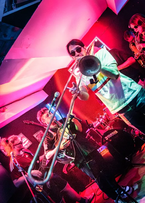 Con apenas el tiempo justo para un cambio de set, la segunda parte de la noche arrancaba con una entrada que ya anunciaba lo que vendría: sección de vientos afilada, percusión precisa y una base rítmica que no entendía de pausas. Ocho músicos subieron a escena para transformarlo todo en un torbellino controlado. Desde los primeros compases de Se huele cumbia, Los Justicieros dejaron claro que la fiesta no había terminado, sino que recién despegaba.