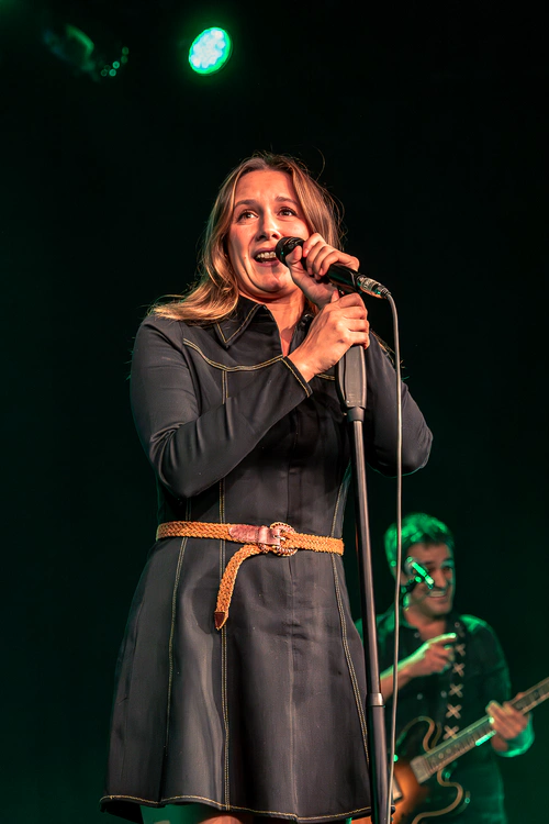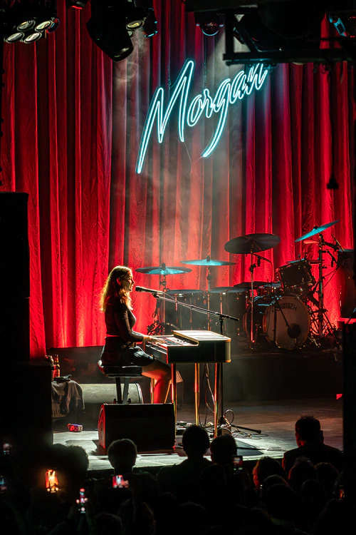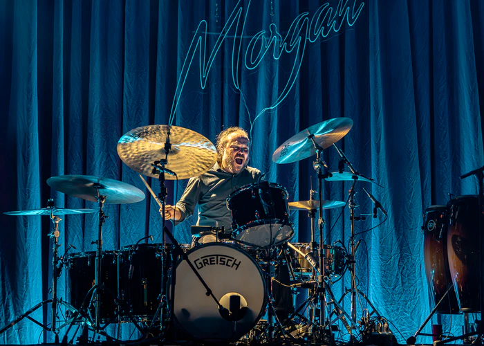 El escenario revela su concepto: cortina roja de gran formato y un neón azul con el nombre de Morgan presidiendo el espacio. Batería, percusiones, teclados, bajo, piano y guitarra encajan como un mecanismo preciso, todos al servicio del directo, y la voz de Carolina de Juan sostiene el relato con una elegancia natural, de esa que tiene por ADN. El grupo empieza a tejer su red con Blue eyes, El Jimador y Attempting. El comentario se repite por la sala: qué bien suena, qué limpio es este directo. No es una frase hecha; es una constatación técnica y emocional.