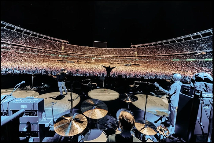 Uno de los momentos memorables de la noche llegó en Cigarettes & Alcohol, cuando la banda invitó al público a realizar el Poznan. El Monumental respondió con miles de personas saltando de espaldas al unísono brazos enlazados y una energía que convirtió el estadio en un mar en movimiento.